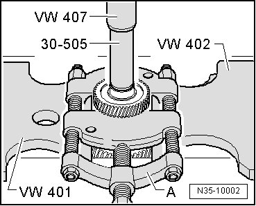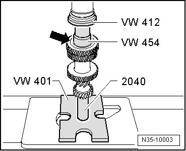 - Install the thrust pad 16.5/28 mm dia. (VW 431) and the thrust piece (40-105) on the input shaft before installing the puller.
