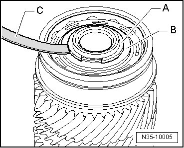 - Measure the gap between the grooved ball bearing - B - and the installed lock ring - A - with a feeler gauge - C -.