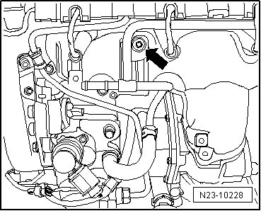 - Remove the bolt - arrow - from the intake manifold for the fuel return line.