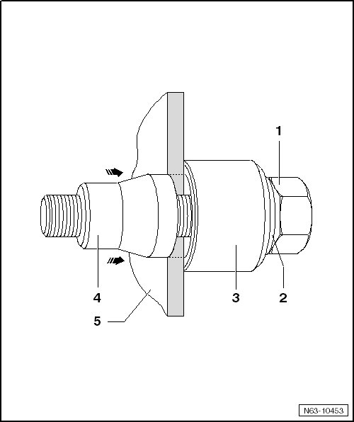 - Position the stamping holes with the bolt head - 1 -, washer - 2 - and counterholder- 3 - on the inside of the bumper cover - 5 -.