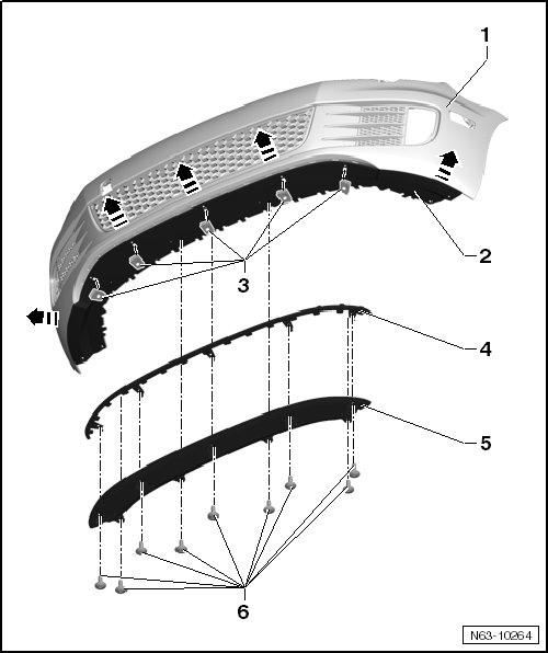 - Remove the spoiler lower section - 2 - from the catches - arrows - inside the front bumper cover - 1 -.