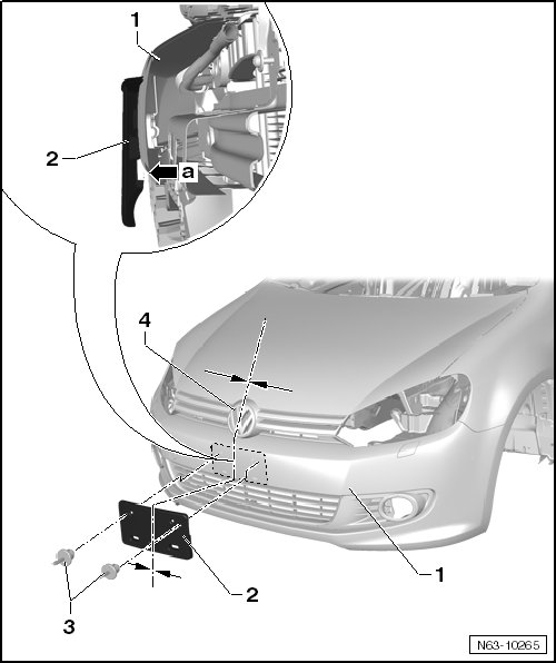 - Center the license plate holder - 2 - to the emblem - 4 - on the front bumper cover - 1 -.