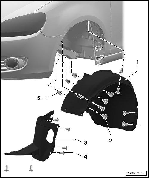 • Remove the upper expanding nut in the fender when installing the rear section of the wheel housing liner for Golf R with 19" wheel rims.