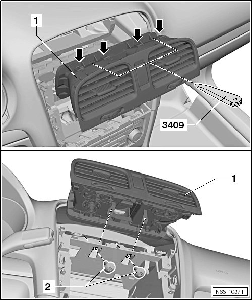 - Remove the four clips - arrows - using the trim removal wedge (3409) , and remove the center vent from the instrument panel - 1 -.
