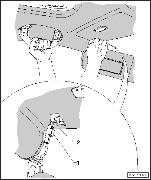 - Carefully pull connector - 1 - out through opening in headliner, pulling out just far enough until connector is located closely beneath headliner.