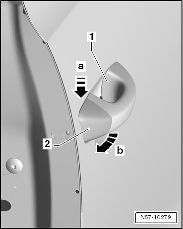 - Press the lock cylinder cap - 2 - on to door - arrow b - until cover cap engages with lock cylinder.