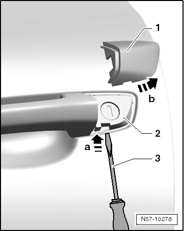 - Gently remove the cap - 1 - from the door with the screwdriver - arrow b -.