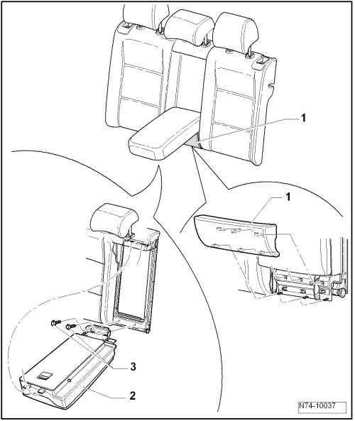 - Open storage unit - 2 - and remove two bolts - 3 - (9 Nm).