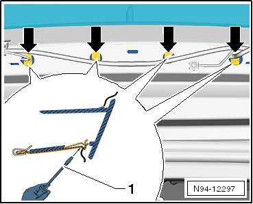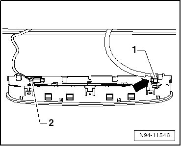 - Place the (T10039/1) - 1 - at the top between the High-mounted brake lamp bulb (M25) - 2 - and the rear lid.