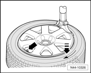 - Push the tires between the tire valve/tire pressure sensor and the mounting head into the bed - direction of arrow -.