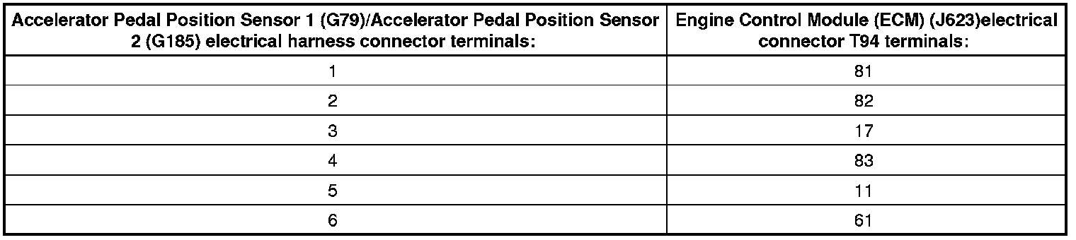- Using a multimeter, check the Accelerator Pedal Position Sensor 1 (G79)/Accelerator Pedal Position Sensor 2 (G185) electrical harness connector terminals to the Engine Control Module (ECM) (J623) electrical connector T94 for an open circuit. Refer to Wiring Diagrams for pin locations.