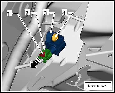 - Disconnect the connector lock - 1 - in the - direction of the arrow - and disconnect the connector- 2 - from front passenger side rear side airbag crash sensor (G257) - 3 -.