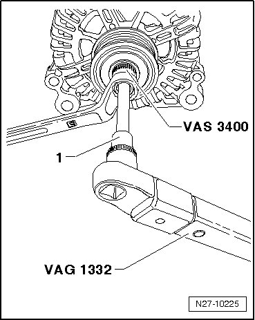 - Insert (VAS 3400) into ribbed belt pulley with freewheel of generator using open end wrench 17 mm.