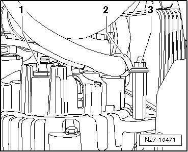 - Remove both of the bolts - 1 - and the nut - 2 - for the fuel filter - 3 - and lay them aside. The fuel hoses can remain connected.