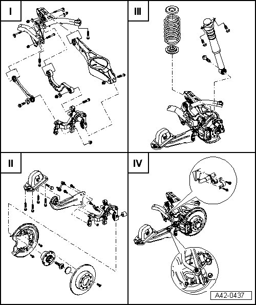 II - Refer to => [ Wheel Bearing Housing and Trailing Arm Assembly Overview ] Wheel Bearing Housing and Trailing Arm Assembly Overview.