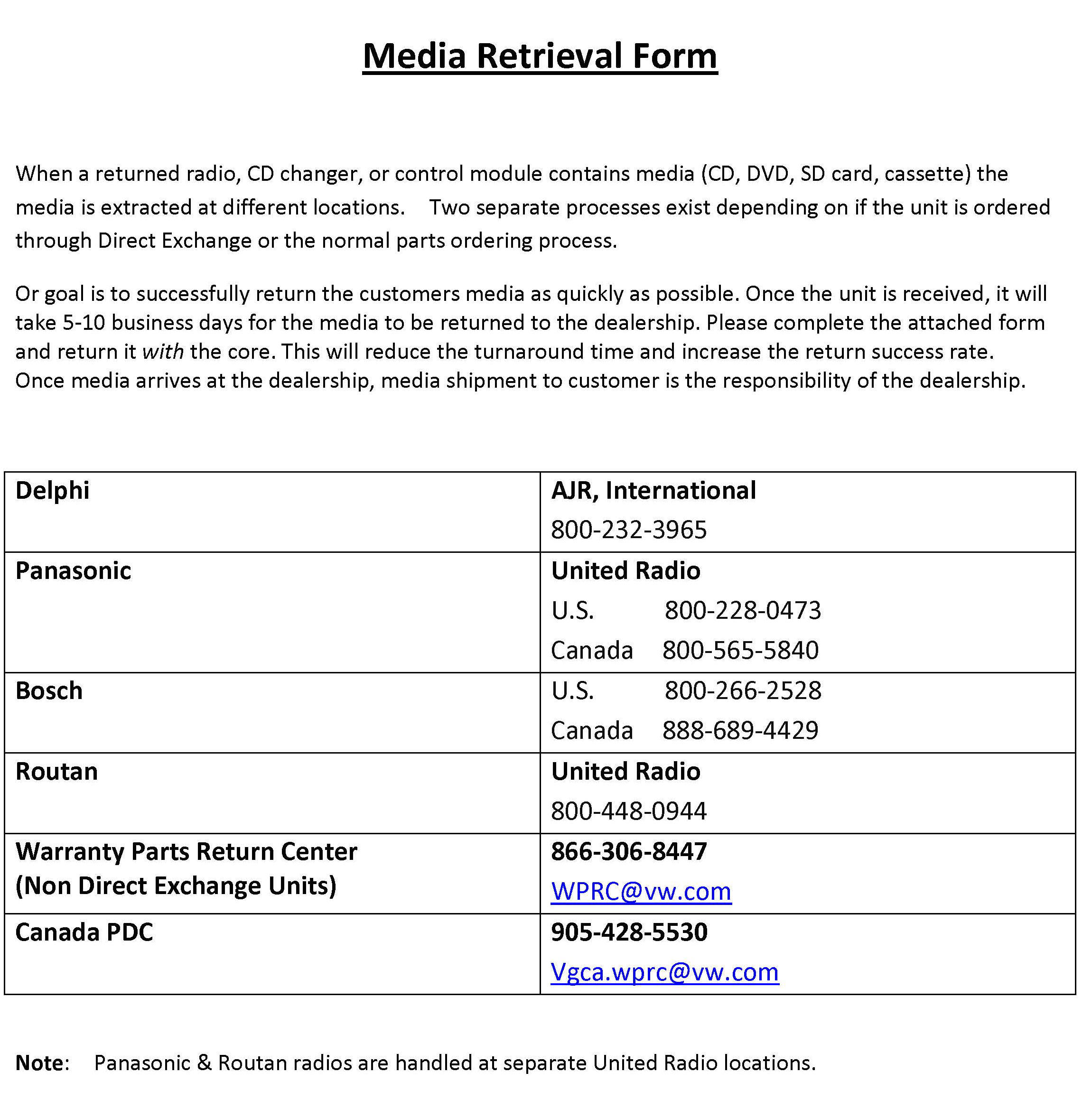 ^ Direct Exchange: Fill out the media retrieval form and send with the radio core to the appropriate remanufacturing center (AJR/United/Bosch).