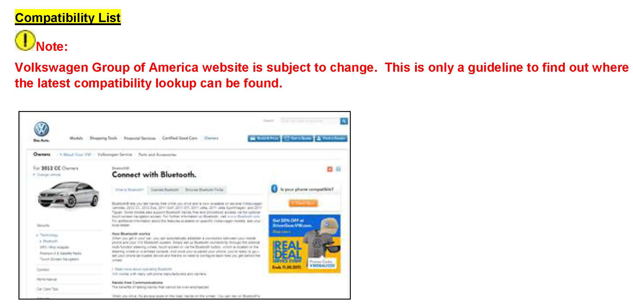 The compatibility list can be found on www.vw.com. To get there do the following: