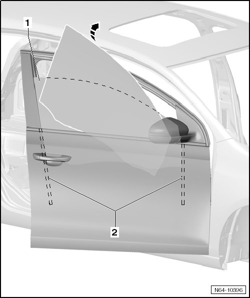- Lift the rear door window - 1 - and remove it in - direction of arrow - from the window guides - 2 -.