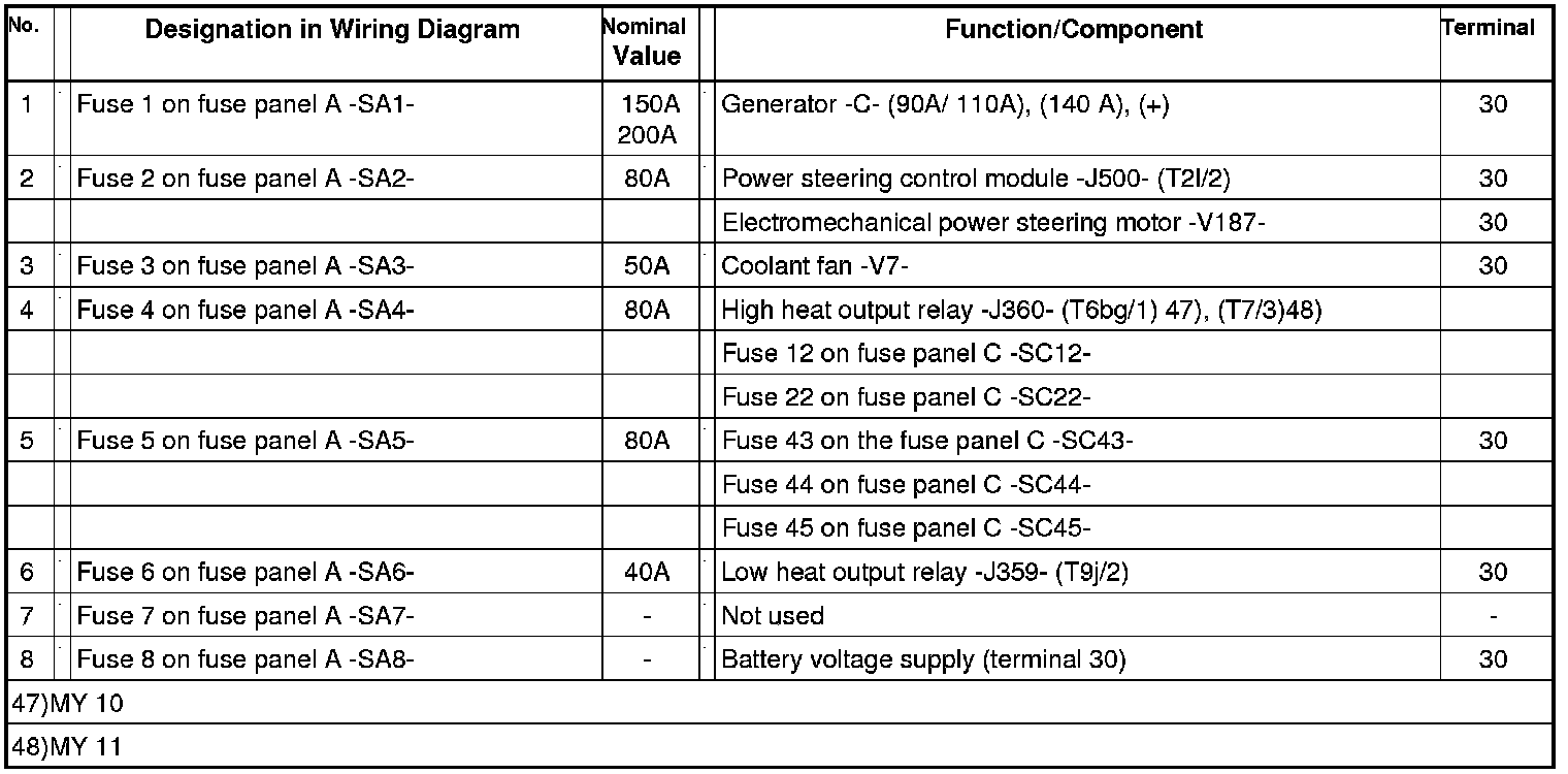 Fuse Assignment (SA) On Fuse Panel A, On The E-box, From July 2009