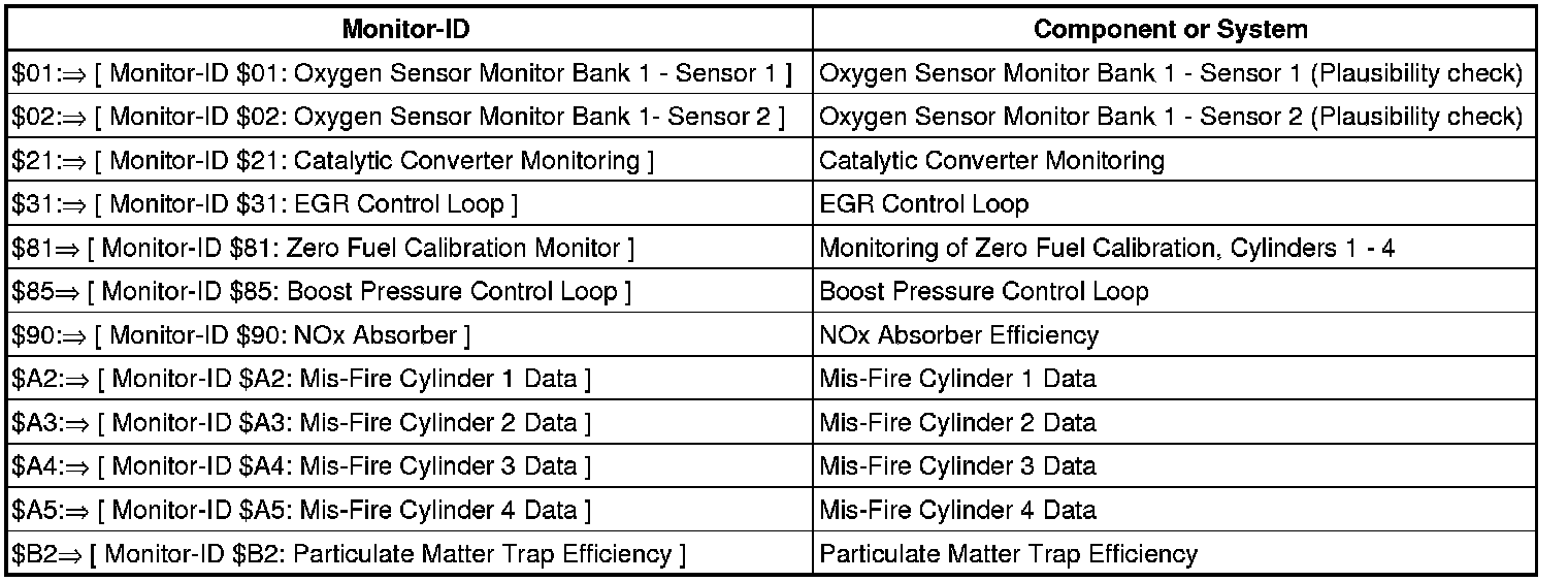 Diagnostic Mode 06 makes it possible to retrieve test results for special components and systems which are continuously or not continuously monitored. If the diagnosis of a system is complete, the diagnostic result and the corresponding thresholds are saved and displayed in mode 06. This data remains saved (even with the ignition off) until either new diagnostic results become available or the DTC memory is erased.