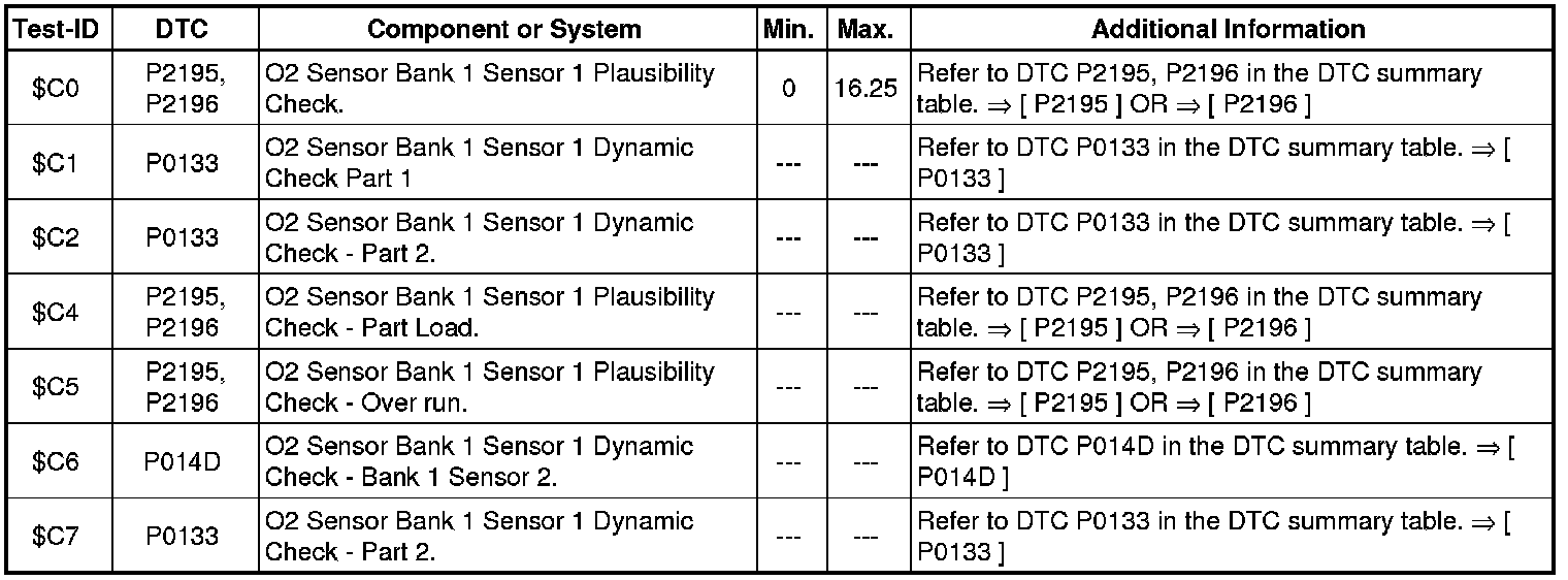 - If any of components or systems fail to meet the specified values. Refer to Diagnostic "Mode 03: Interrogating Fault Memory" to check for stored DTC's or the corresponding diagnostic repair procedure => [ Diagnostic Mode 03 - Read DTC Memory ]. Diagnostic Mode 03 - Read DTC Memory