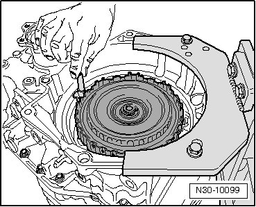 The transmission must be clamped secure in the holding fixture (VW 313) or in the engine and transmission holder (VAS 6095). Refer to => [ Transmission, Transporting and Securing To Assembly Stand ] Transmission, Transporting and Securing To Assembly Stand. Do not turn it.