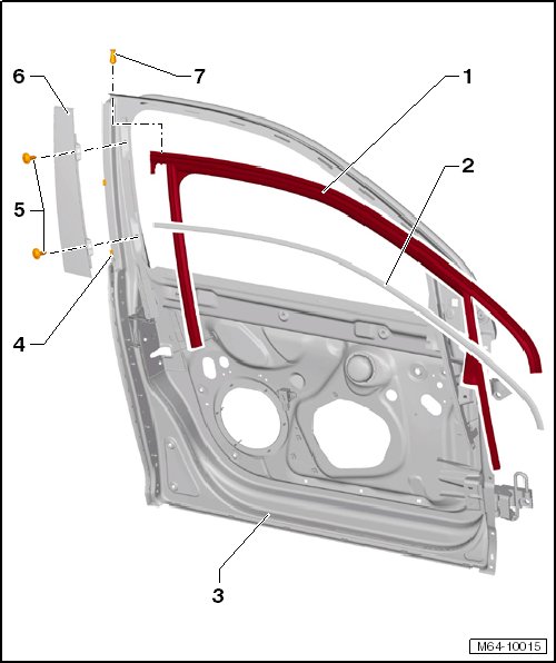 - Remove the two bolts - 5 - and remove the trim - 6 - from the door - 3 -.