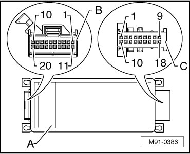 B 20-pin connector, red, to the Telephone baseplate (R126) (Does not apply to US vehicles)