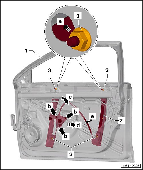- Loosen the top nuts - 3 - (do not remove them), slide them together with the window regulator in - direction of arrow a - and push them into the door.