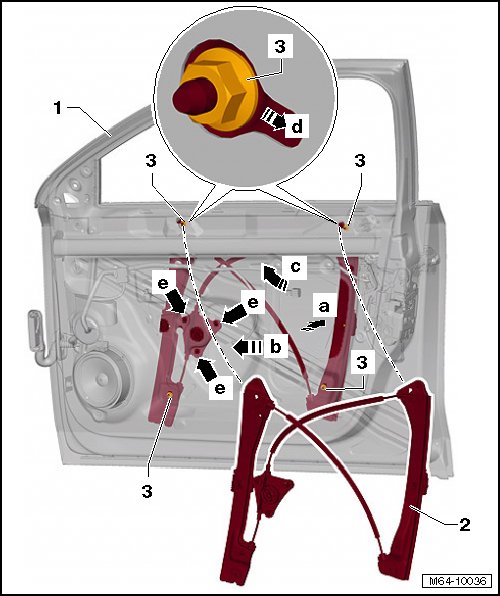 - Swivel the window regulator - 2 - with the cable reel out through the opening in the door - arrows c -, - d - and - e -.