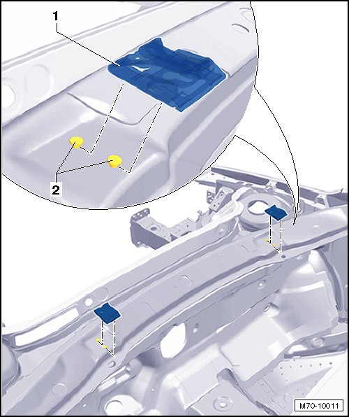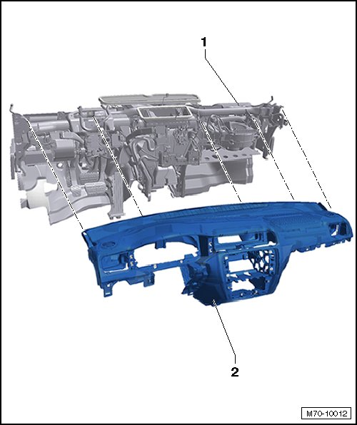 - Remove the instrument panel - 2 - from the mounts near the windshield and from the instrument panel crossmember - 1 -.