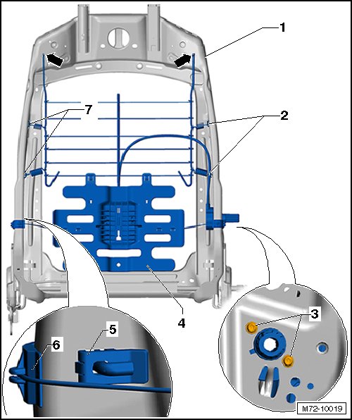 - Disengage the side springs - 2 - and - 7 - from the backrest frame - 1 -.