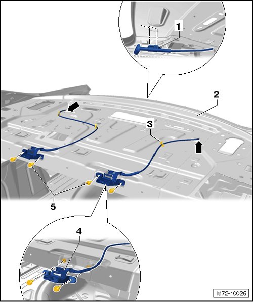 - From inside the luggage compartment, unlock the locking unit - 1 - on both side and guide and guide it out of the rear wall - 2 - - arrows -.