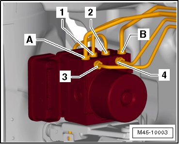 - Mark the master brake cylinder lines - A - and - B - and disconnect from the ABS hydraulic unit.
