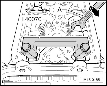 - If the bolts could not be installed easily, attempt to rotate the exhaust camshaft at the recess using an open end wrench - A - (18 or 19 mm, depending on wrench width) slightly in the - direction of the arrow - in order to eliminate any play in the chain.