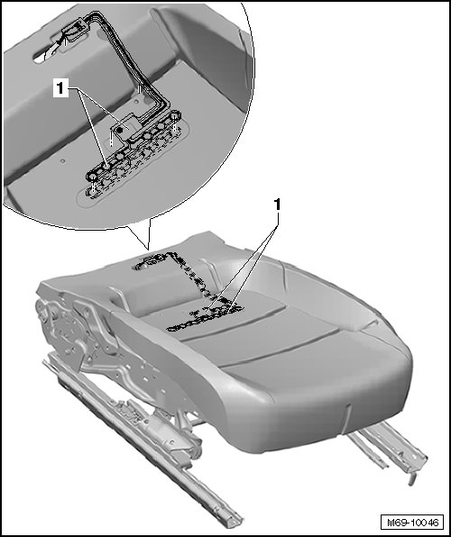 The front passenger seat occupant sensor (G128) - 1 - is glued to the upholstery. It is not possible to remove and install separately, sensor must be replaced with upholstery.