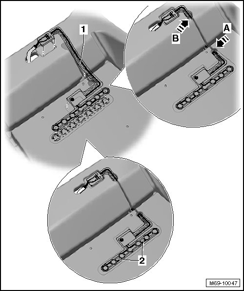 - Push the wiring harness - arrows A and B - into the opening in the upholstery.
