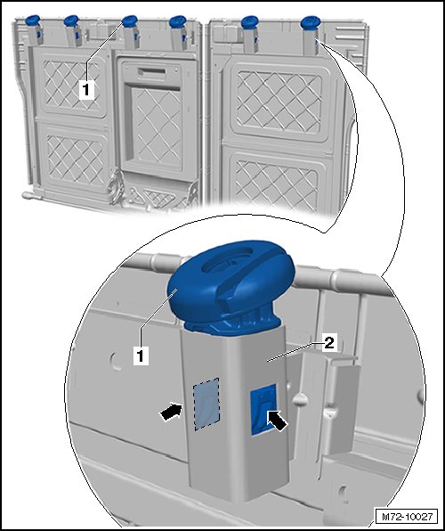 - Open the tabs - arrows - with a screwdriver or a drift and remove the headrest guide - 2 - from the backrest frame - 2 -.
