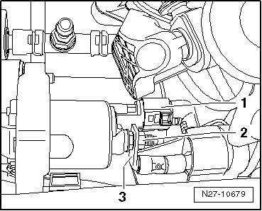 - Remove the nut - 1 - from the bolt at the bottom of the starter.
