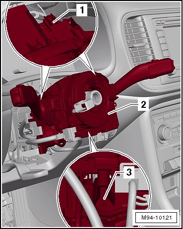 - Release the catches - 1 - (on top) and - 3 - (on the bottom), and remove the steering column combination switch - 2 - straight toward the back from the steering column switch base carrier.