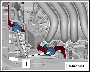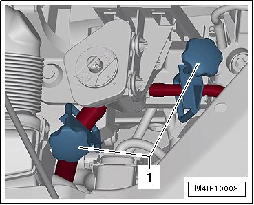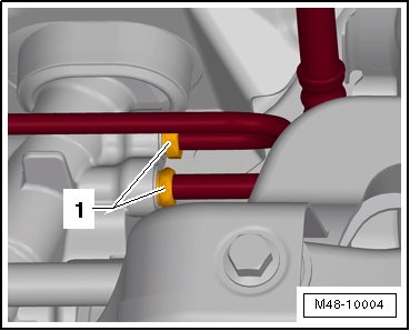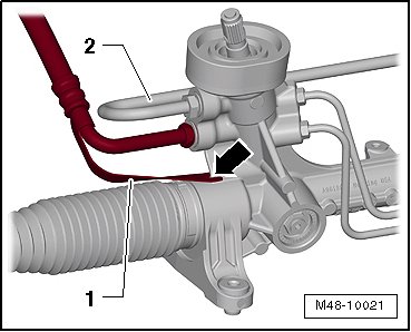 • The strap - 1 - on the hose must be supported by the steering gear - arrow -.
