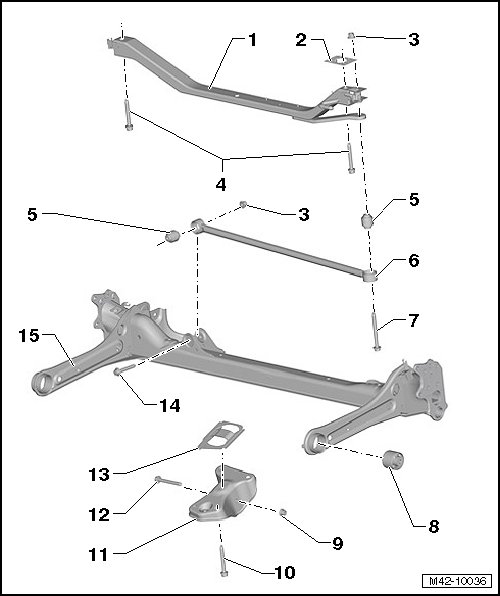 • Removing and installing, refer to => [ Axle Beam Bonded Rubber Bushing ] Axle Beam Bonded Rubber Bushing.