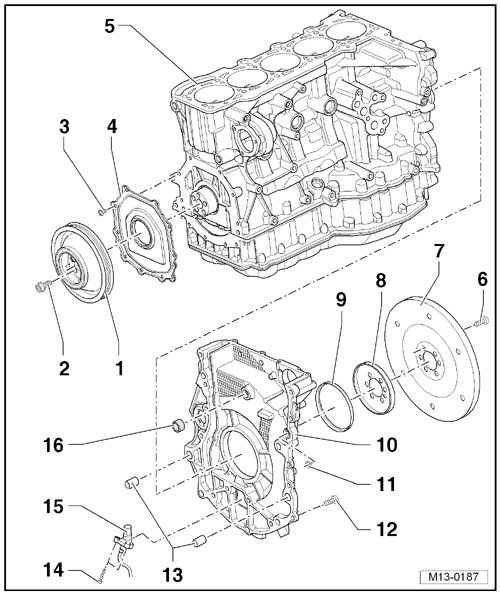 • Removing and installing, refer to => [ Sealing Flange, Belt Pulley Side ] Service and Repair.