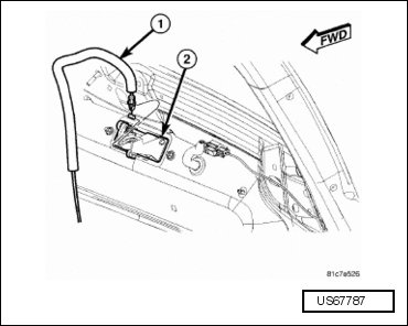 - Disconnect the power locking latch cable (1) from the exterior liftgate handle (2) and remove the cable from the handle.