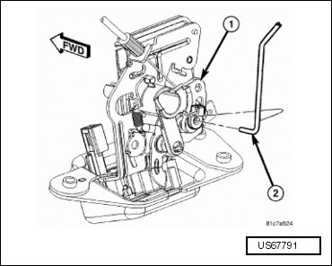 - Connect the lock cylinder rod (2) to the liftgate latch (1) and engage the retaining clip that secures the rod to the latch.
