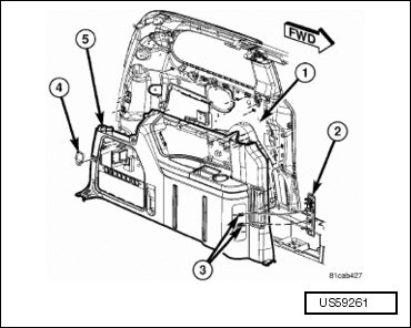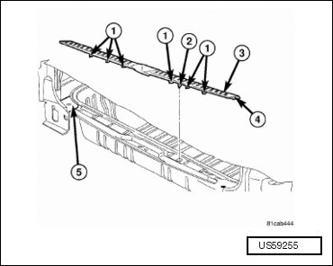 - Carefully engage the scuff plate end tabs (4) into the left and right quarter trim panels (5).