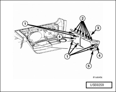 - Carefully disengage the scuff plate end tabs (4) from the left and right quarter trim panels (5).