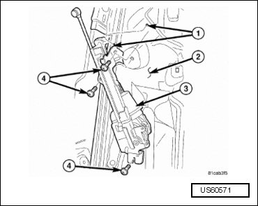 - Insure that the drive unit bracket mounting tab is properly seated into the hole on the D-pillar (1).