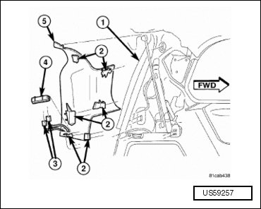 - Push the upper D-pillar trim onto the D-pillar to engage the trim retaining clips (2).