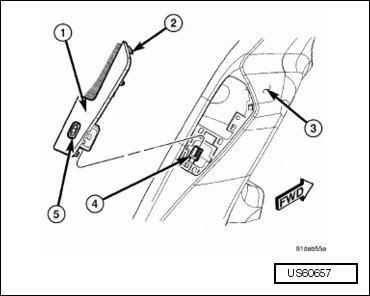 - Position the power liftgate D-pillar switch (5) into the switch bezel (1) and press into position until the tabs are fully engaged.